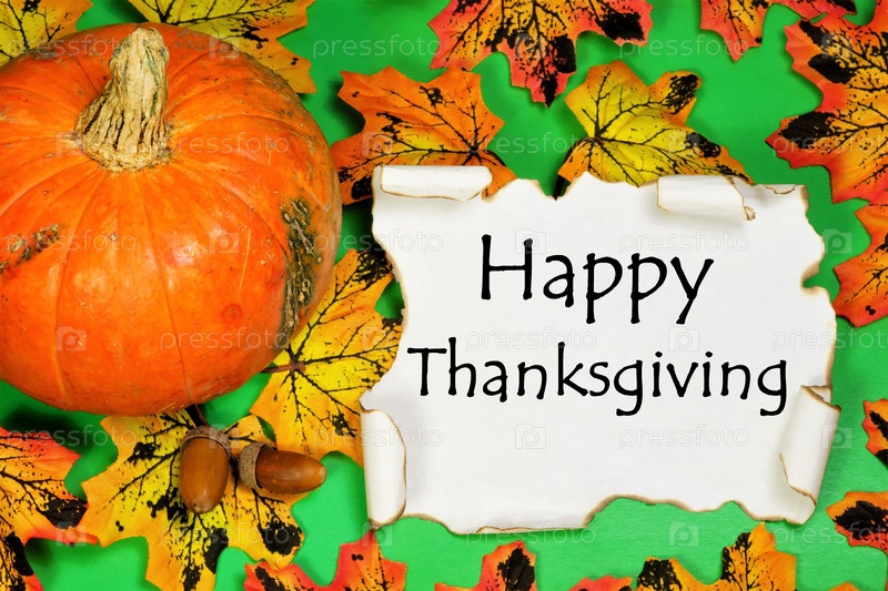 Счастливого дня благодарения. Надпись на винтажном свитке на фоне тыкв, желудей и осенних листьев