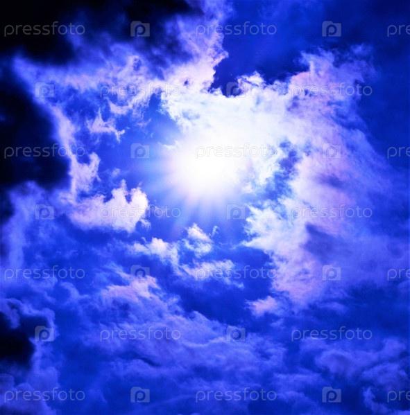 Голубое небо и яркие лучи солнца пробиваются сквозь пушистые облака. Фон для дизайна и творчества-абстрактное уникальное разнообразие-натуральный водяной пар