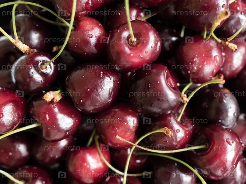 Селективный фокус, сочные органические вишни с каплями воды. Еда ягодный фон спелой вишни