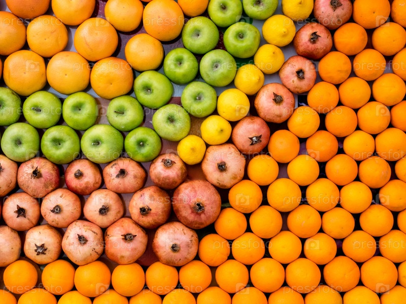 Фруктовый фон из зеленых яблок, гранатов, апельсинов и лимонов на фермерском рынке