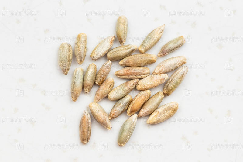 Несколько цельных зерен ржи крупным планом на сером