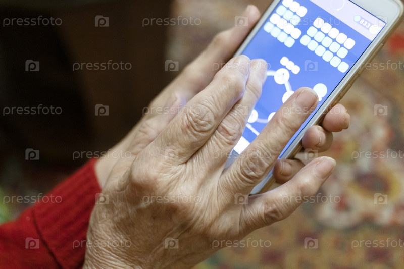 Рука пожилой женщины, играющей на смартфоне вечером