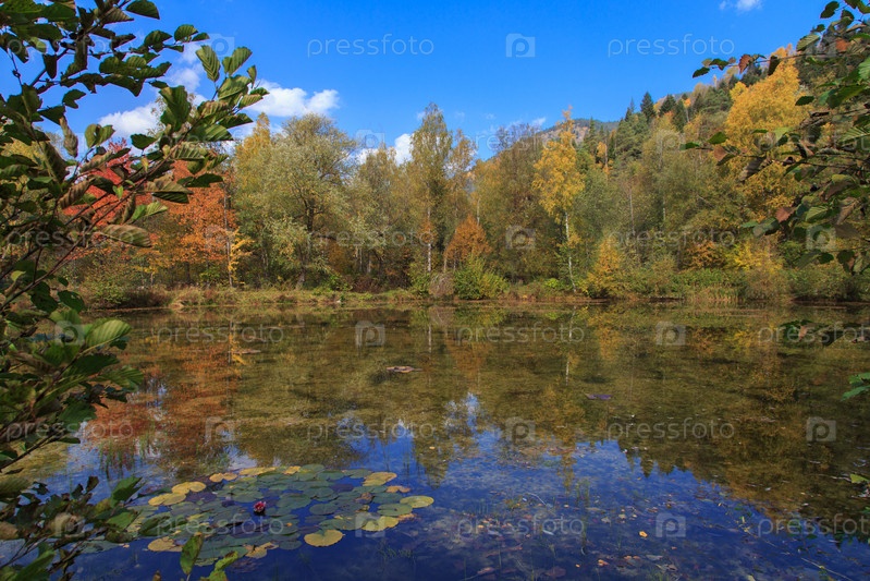 Полуоткрытая розовая кувшинка в чистом горном озере, окруженная зелеными листьями воды на фоне осеннего разноцветного леса и гор. Латинское название водяной лилии — нимфея