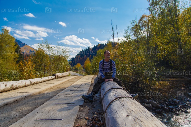 Портрет расслабленного зрелого мужчины, сидящего на деревянном бревне у горной реки. Зрелый мужчина наслаждается солнечным осенним днем у реки. Голубое небо и белые облака в солнечный осенний день в горах
