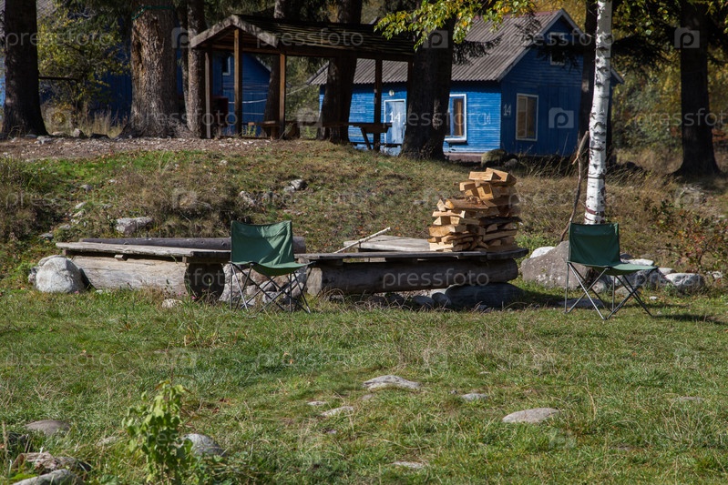 Рубленые дрова из бука сложены на деревянной скамейке. На заднем плане ствол березы и серый камень