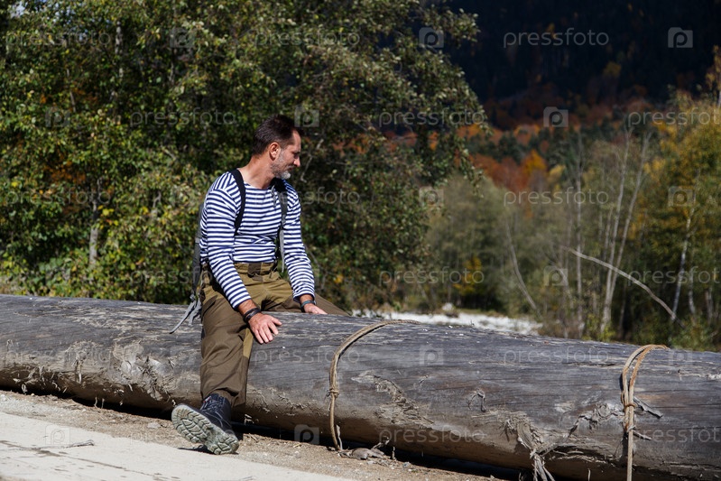 Портрет расслабленного зрелого мужчины, сидящего на деревянном бревне у горной реки. Зрелый мужчина наслаждается солнечным осенним днем у реки. Голубое небо и белые облака в солнечный осенний день в горах