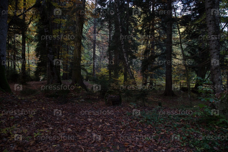 Темный осенний лес, усыпанный опавшими листьями. Рост молодых елей