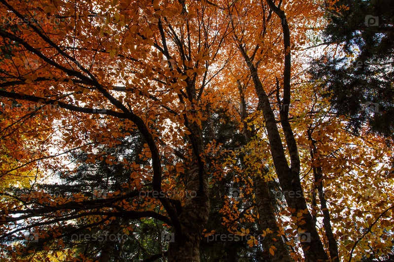 Осенний пейзаж с видом снизу на свежую многоцветную листву вдоль ствола дерева
