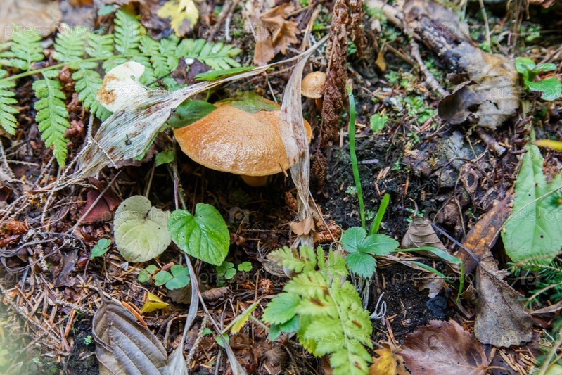 Гриб Suillus Bovinus в осеннем лесу среди засохших листьев и зеленой травы