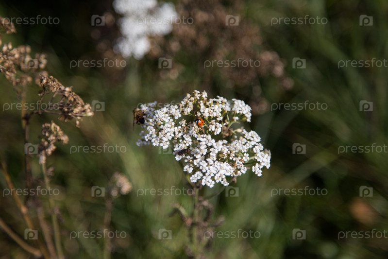 Цветущий тысячелистник обыкновенный. На цветах есть божья коровка, пчела и муха