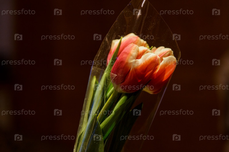 Букет тюльпанов в прозрачной пленке на темном размытом фоне