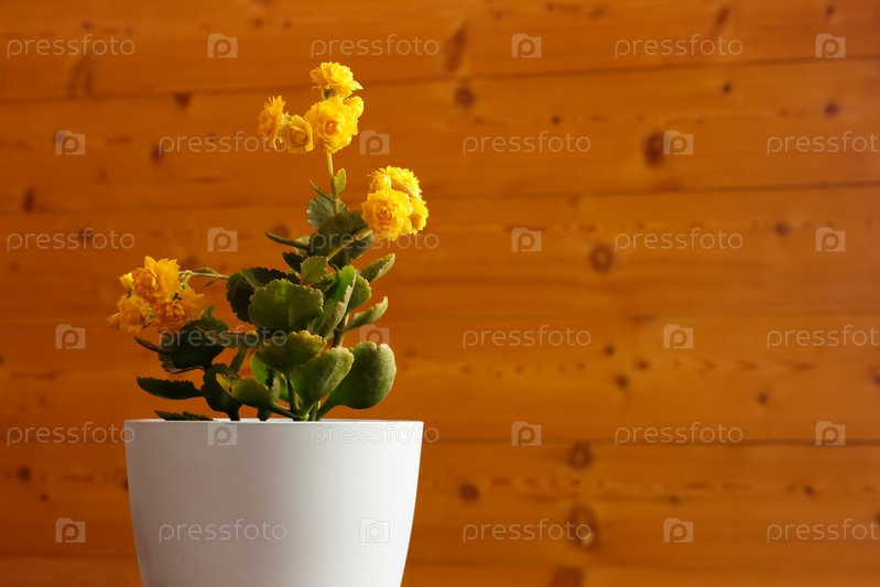 Цветущий желтый каланхоэ на размытом фоне стены из досок
