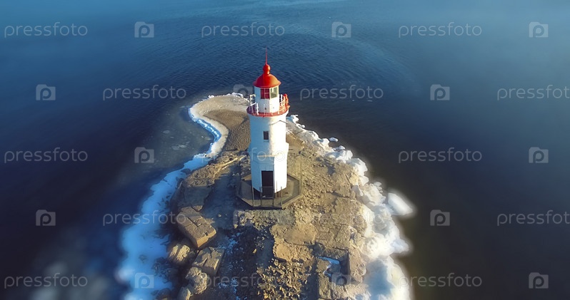 Аэрофотосъемка маяка Токарева на фоне синего моря. Владивосток, Россия
