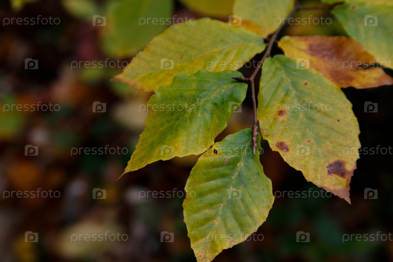 Разноцветные листья бука на ветке осенью на темном размытом фоне