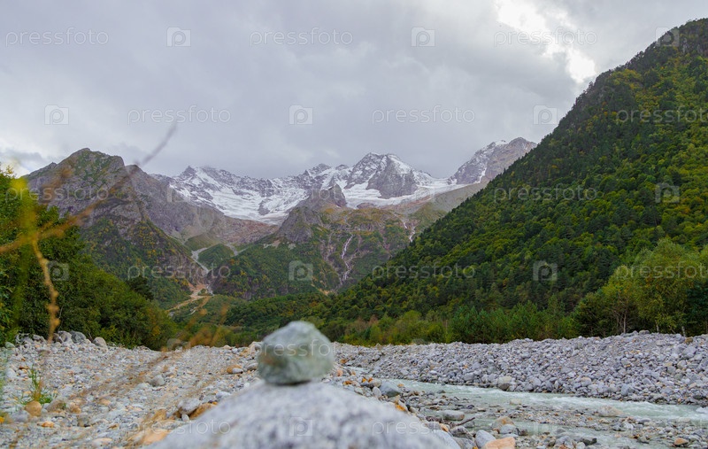 Горная река в Осетии, ледник Тана в горах. Кавказские горы