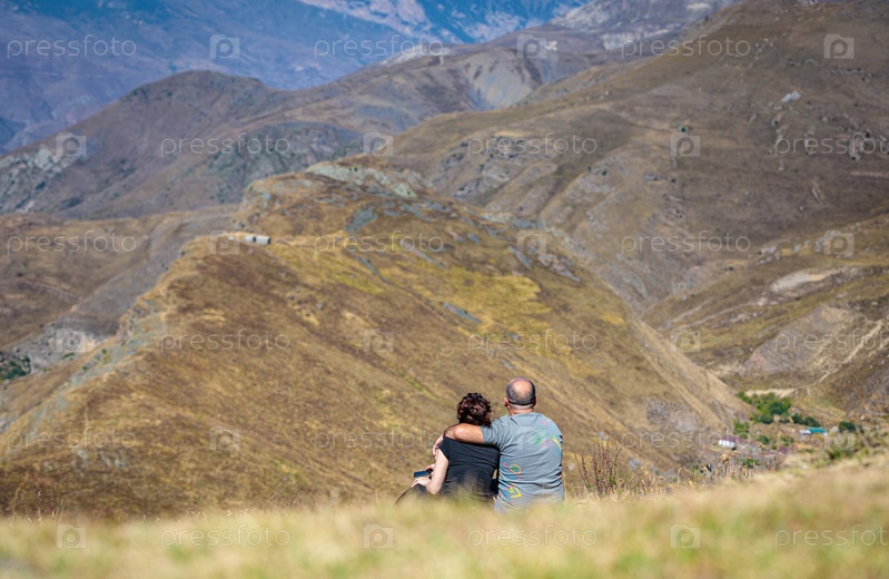 Мужчина и девушка сидят на холме в горах. Счастливая пара. Мужчина обнимает девушку. Кавказские горы, Осетия