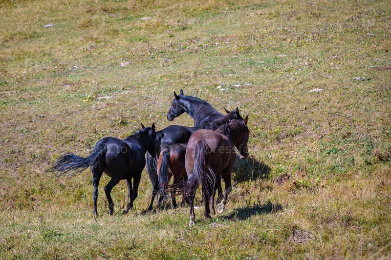 Стадо лошадей пасется на лугах Кавказских гор
