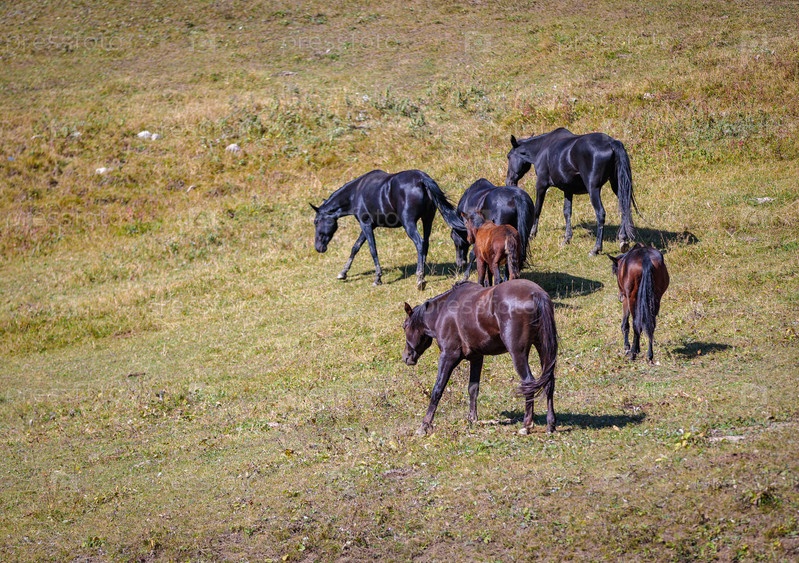 Стадо лошадей пасется на лугах Кавказских гор