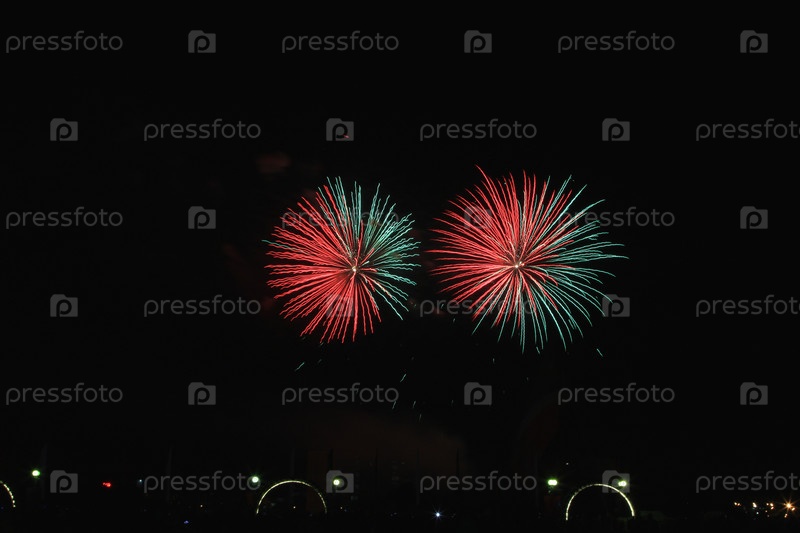 Разноцветный фейерверк в темном небе, празднование дня города