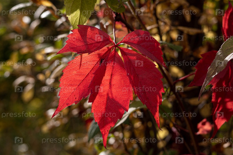 Крупный красный лист винограда, подсвеченный закатным осенним солнцем, на размытом фоне листвы