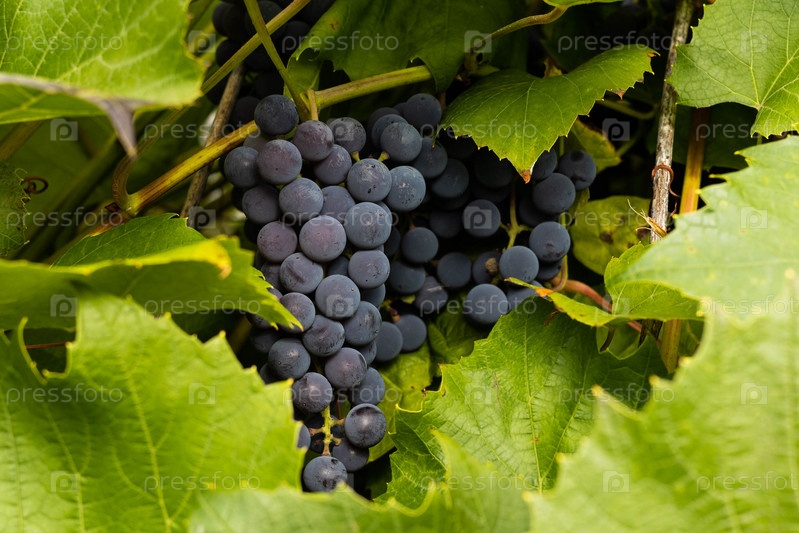 Гроздь темно-синего винограда сорта Изабелла среди зеленой листвы