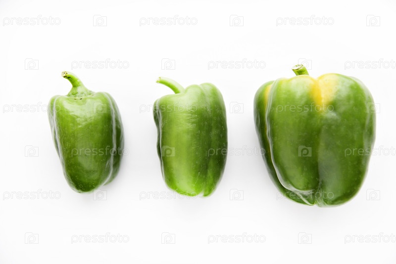 Сочные зеленые и желтые плоды перца на белом фоне. Красивый блестящий и вкусный перец
