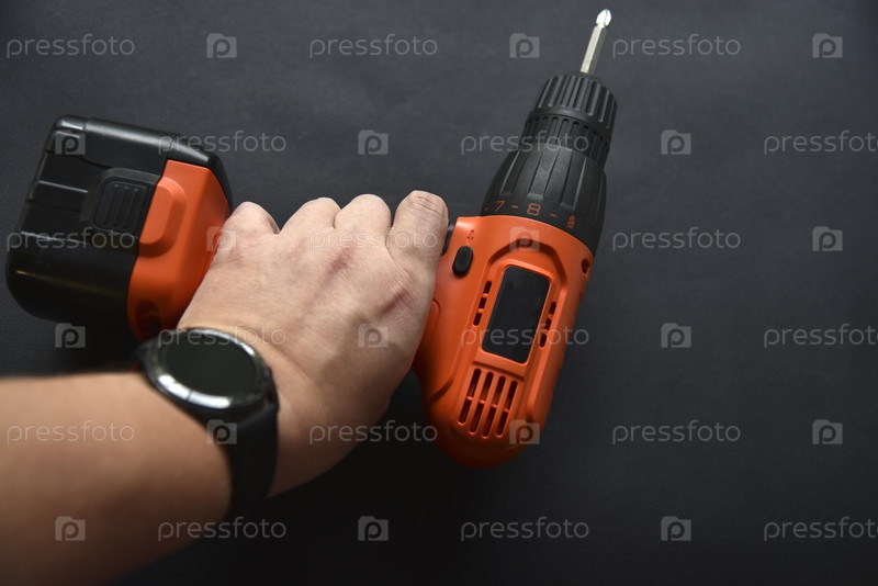 Оранжевая отвертка на черном фоне в руке. Отвертка и электрическая дрель с блоком питания