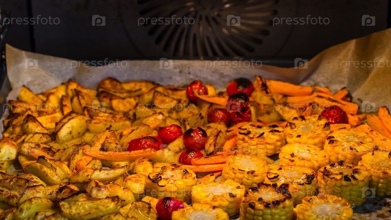 Овощи, запеченные в духовке - картофель, помидоры, морковь и кукуруза