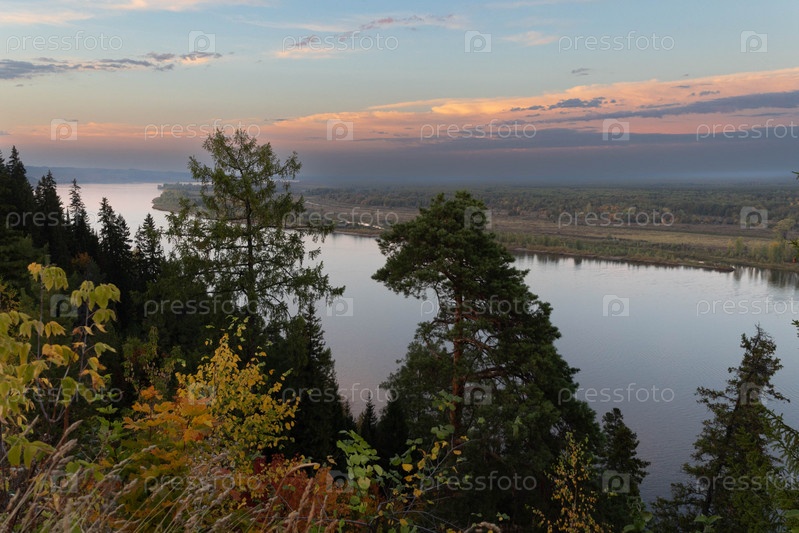 Прекрасный вид на осенний закат на реке Кама со смотровой площадки в городе Сарапуле