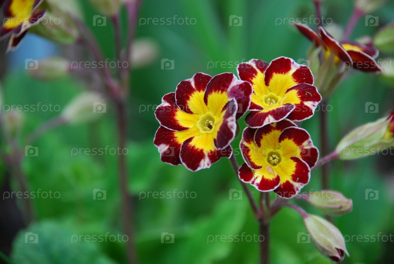 Желто-красные мелкие цветки. Три ярких, в центре желтых по краям бордовых цветков первоцвета. Часть бутонов раскрыта, часть еще не распустилась, вокруг зеленая листва
