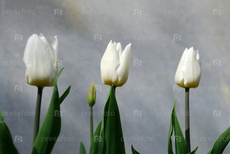 Три белых тюльпана растут рядом друг с другом. На тонких зеленых стеблях три белых полураспустившихся цветочных бутона под лучами солнца на сером фоне