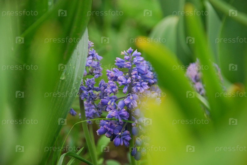 Фиолетово-голубые мелкие цветки. Много цветков мускари, ярко-голубых с фиолетовым отливом. Часть бутонов раскрыта, часть еще не распустилась, вокруг зеленая листва и трава