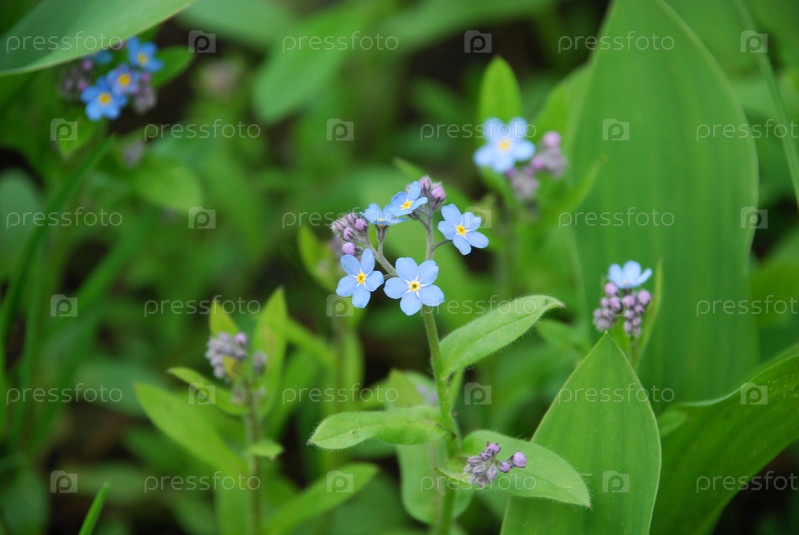 Мелкие цветы Лесные незабудки. Несколько маленьких светло-голубых цветков Лесной незабудки в окружении зеленой травы и широких листьев тюльпанов