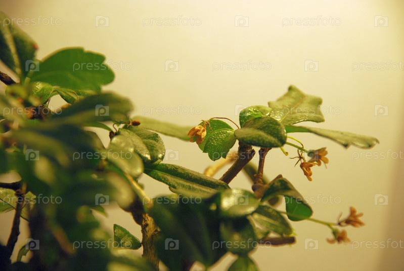 Небольшое дерево бонсай кармона мелколистная. На светлом фоне бонсай представляет собой вечнозеленый кустарник, который со временем достигает высоты около 40см. Имеет толстый ствол и жесткие побеги, миниатюрное деревце