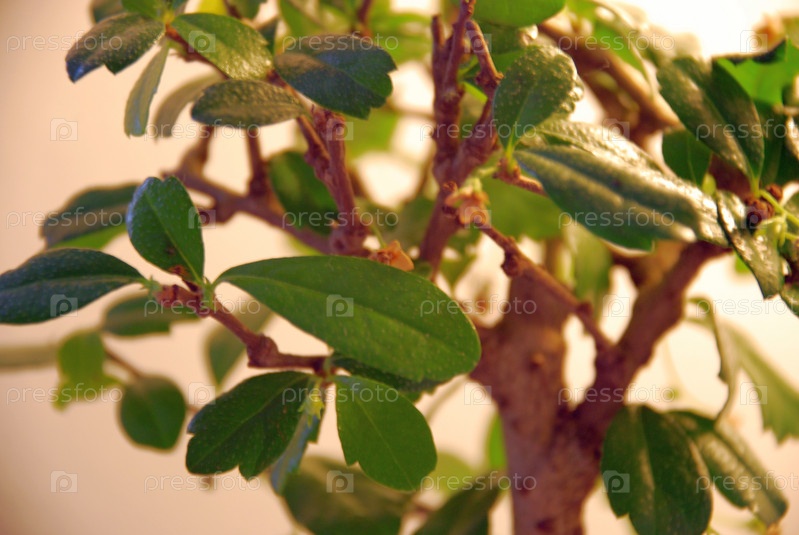 Небольшое дерево бонсай кармона мелколистная. На светлом фоне бонсай представляет собой вечнозеленый кустарник, который со временем достигает высоты около 40см. Имеет толстый ствол и жесткие побеги, миниатюрное деревце