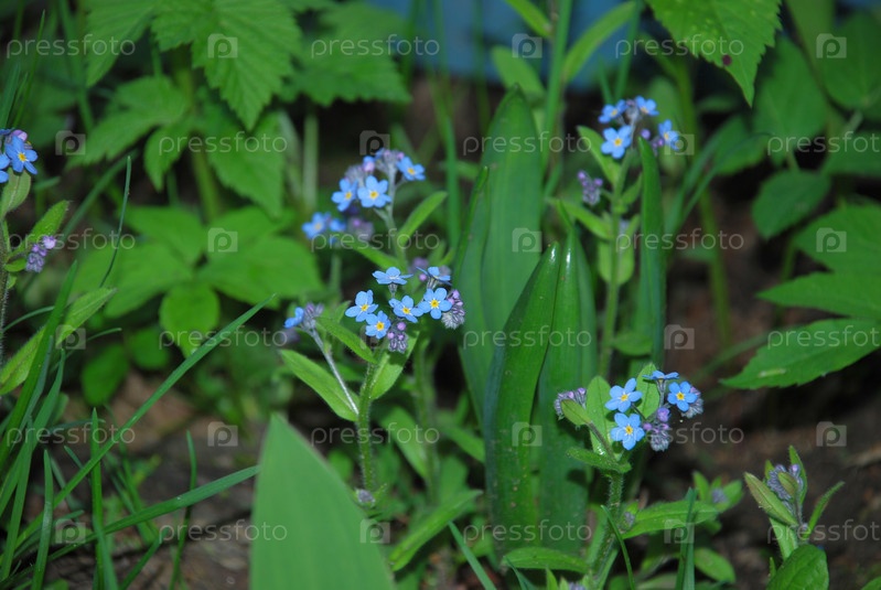 Мелкие цветы Лесные незабудки. Несколько маленьких светло-голубых цветков Лесной незабудки в окружении зеленой травы и широких листьев тюльпанов