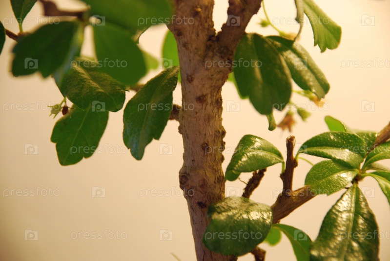 Небольшое дерево бонсай кармона мелколистная. На светлом фоне бонсай представляет собой вечнозеленый кустарник, который со временем достигает высоты около 40см. Имеет толстый ствол и жесткие побеги, миниатюрное деревце