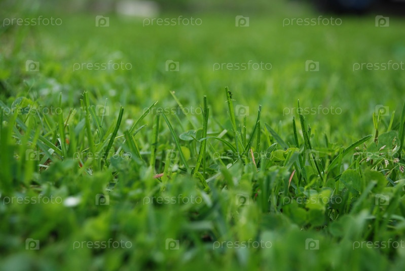 Зеленый фон из свежескошенной травы. Крупный план небольших побегов зеленой газонной травы. Лезвия короткие с зазубренными концами после того, как они были обрезаны