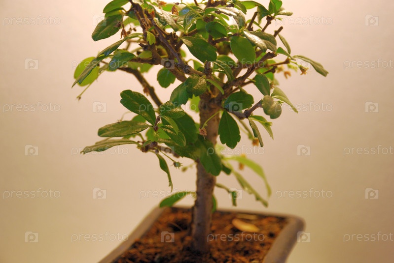 Небольшое дерево бонсай кармона мелколистная. На светло-желтом фоне в прямоугольном черном горшке растет небольшое деревце бонсай – вечнозеленый кустарник, который со временем достигает высоты около 40 см
