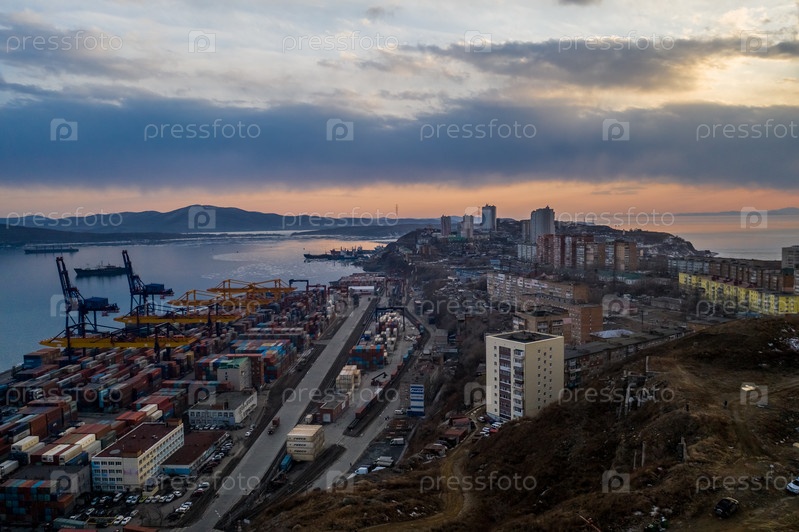 Городской пейзаж с видом на торговый порт