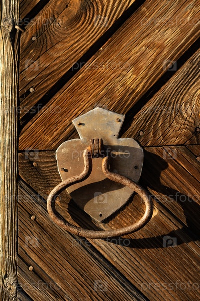 Ржавая дверная ручка на фоне двери деревянного дома