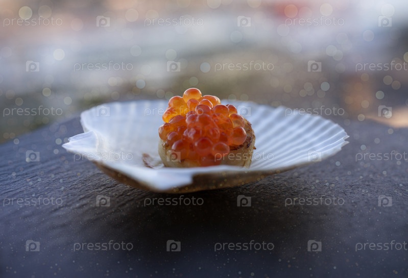 Красная икра на филе гребешка и на белой скорлупе на темном грифельном фоне