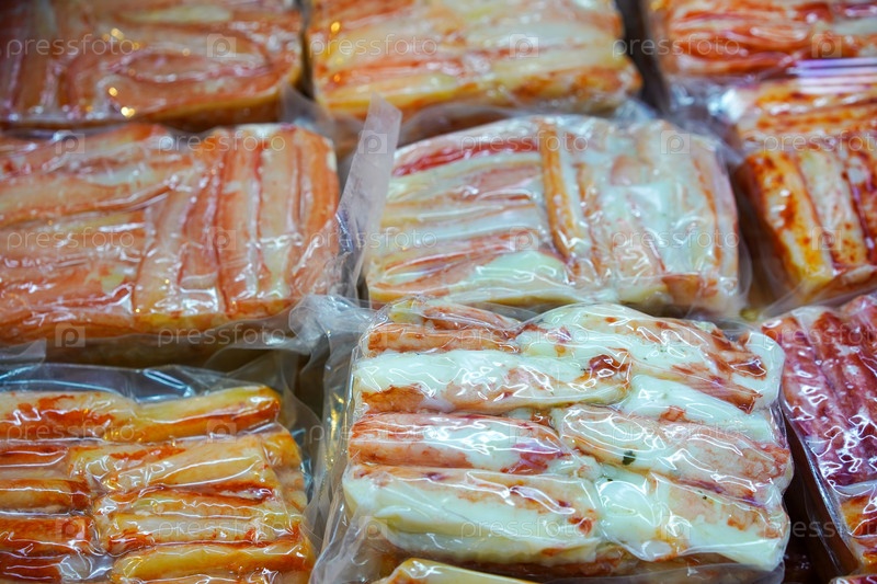 Морепродукты в витрине торгового павильона городского рынка. Владивосток, Россия