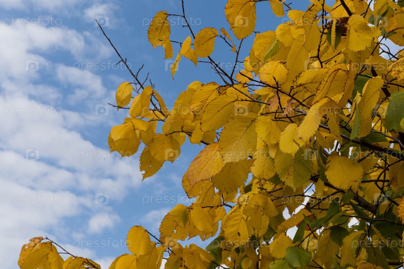 Яркие желтые листья вяза на фоне голубого неба с белыми облаками