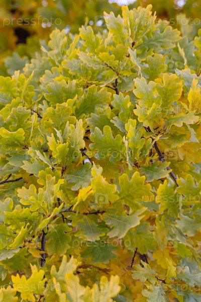 Зелено-желтые дубовые листья на ветке под солнечным светом. дубовый лист фон