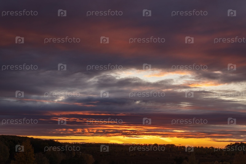 Естественный закат восход солнца над полем. яркое драматическое небо и темная земля. сельский пейзаж под живописным красочным небом на рассвете заката восхода солнца. солнце над горизонтом