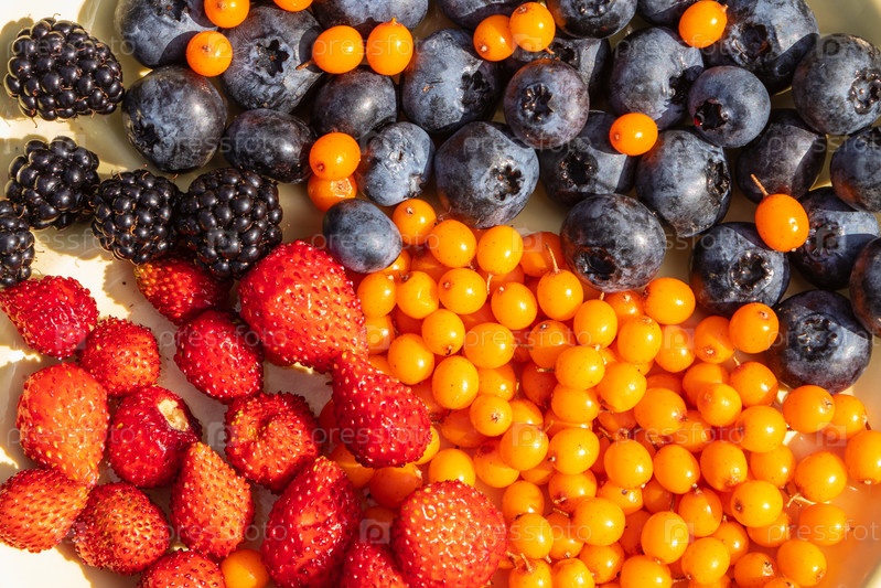 Смешанные разнообразные ягоды, собранные на участке, ягоды в ассортименте из ежевики, клубники, черники, облепихи. Красочная и здоровая концепция. Черный, синий, красный, зеленый. крупным планом