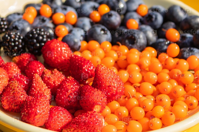 Смешанные разнообразные ягоды, собранные на участке, ягоды в ассортименте из ежевики, клубники, черники, облепихи. Красочная и здоровая концепция. Черный, синий, красный, зеленый. крупным планом