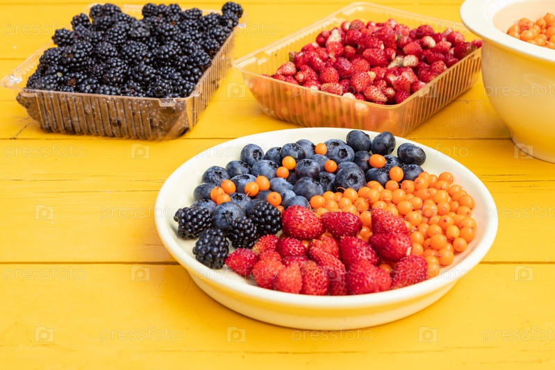 Смешанные разнообразные ягоды, собранные на участке, ягоды в ассортименте из ежевики, клубники, черники, облепихи. Красочная и здоровая концепция. Черный, синий, красный, зеленый. крупным планом