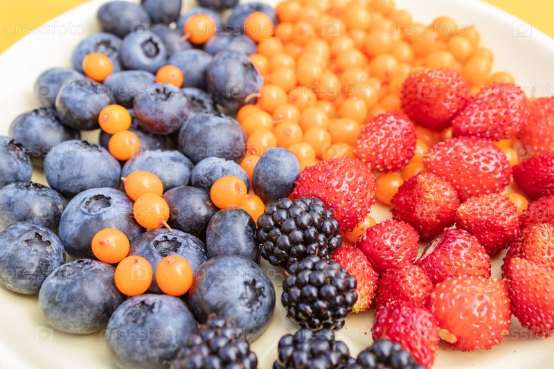 Смешанные разнообразные ягоды, собранные на участке, ягоды в ассортименте из ежевики, клубники, черники, облепихи. Красочная и здоровая концепция. Черный, синий, красный, зеленый. крупным планом